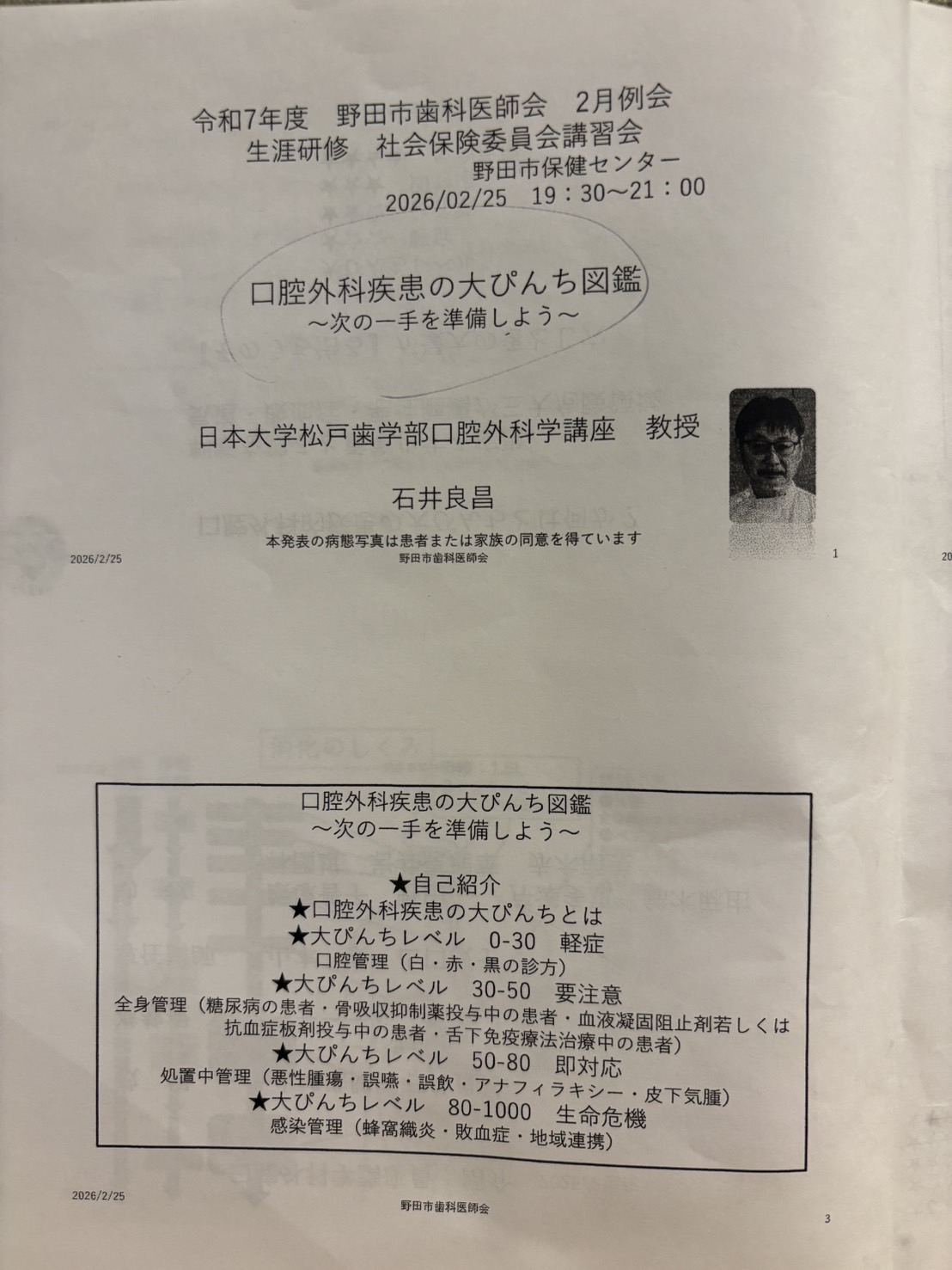 2/25水曜日 野田市歯科医師会では日本大学松戸歯学部 口腔外科学講座の石井教授による講演受講しました高齢者 有病者の内服薬と口腔内所見の特徴等教えて頂きました